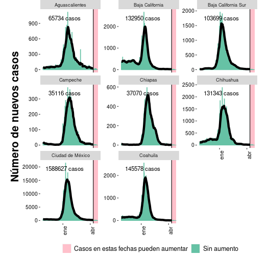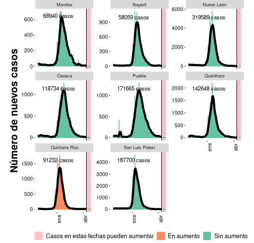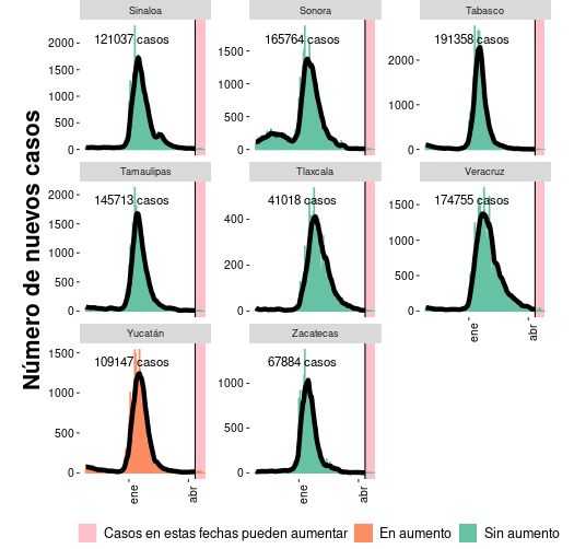Estas gráfica muestra el número de casos por día que mostraron síntomas, e indica cuáles entidades mostraban una tendencia a la alta hasta en los casos que mostraron síntomas hasta hace dos semanas. Cada sección muestra ocho entidades y las 32 entidades federativas están organizadas alfabéticamente. Sube o baja en la página para ver más entidades. También puedes ver la R efectiva de cada entidad.