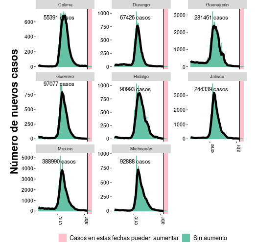 Las zonas metropolitanas han sido las más afectadas por lo que la R efectiva de un estado suele corresponder a la de su mayor zona metropolitana, pero hay algunas diferencias. Estas diferencias pueden ser causadas por zonas metropolitanas que cruzan fronteras estatales, la presencia de múltiples centros urbanos en una entidad, y la expansión geográfica de la epidemia a nuevos municipios.