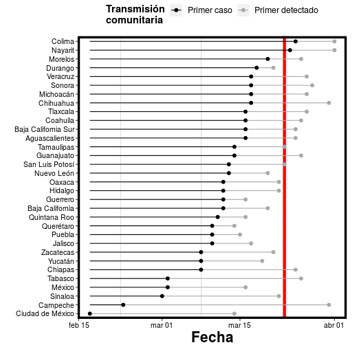 Para cuando iniciaron las medidas de sana distancia (23 de marzo), 30 de los 32 estados ya tenían transmisión comunitaria. Sin embargo, los datos oficiales mostraban 17 estados con este tipo de casos.