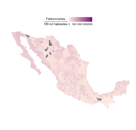 Este mapa muestra la mortalidad por municipio de residencia municipal desde el principio de la epidemia en todo el país. Salvo algunos municipios remotos y poco poblados, se han confirmado muertes por COVID-19 en prácticamente todo el país.