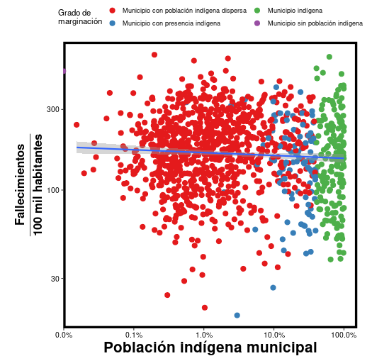 Al ser relativamente pequeños, los municipios indígenas han reportado relativamente pocos casos y defunciones por COVID-19. La gráfica muestra la mortalidad por COVID-19 en municipios pequeños en relación con población indígena de estos municipios. Aunque hay una ligera tendencia hacia una menor mortalidad en municipios indígenas, esta tendencia es débil pero al menos podemos decir que habitantes de municipios indígenas tienen un nivel de riesgo similar a otros municipios pequeños.
